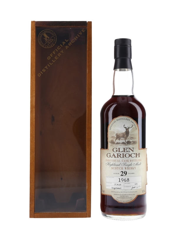 A bottle of Glen Garioch 29 Year Old Highland single malt Scotch whisky. This was distilled on 27 April 1968 and bottled at cask strength from a single hogshead held in the distillery archive.