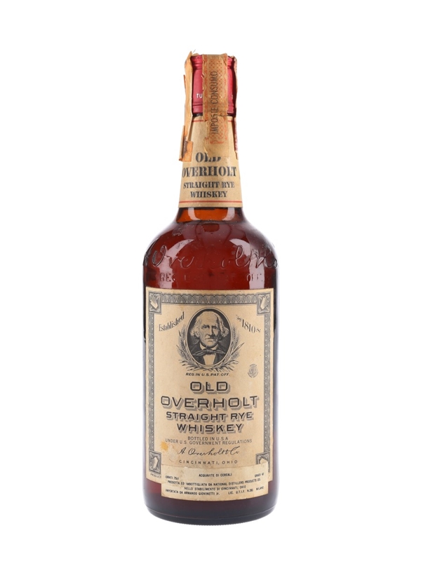 A bottle of Old Overholt straight rye whiskey, distilled in Pennsylvania and bottled in Ohio. This was imported to the Italian market by Armando Giovinetti, we estimate in the 1960s.