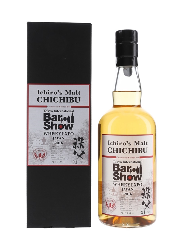 A bottle of Ichiro's Malt Chichibu 2011, distilled from Tipple barley and bottled in 2016 exclusively for the Tokyo International Bar Show Whisky Expo.