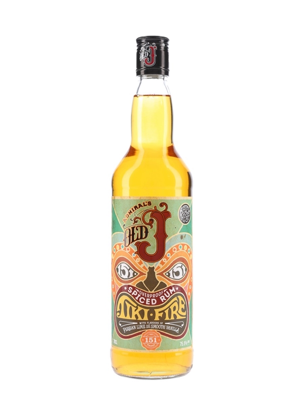 A bottle of Admiral's Old J Tiki-Fire Overproof Spiced Rum. A blend of Caribbean rums flavoured with Persian lime and vanilla. This was bottled at 75.5% ABV.