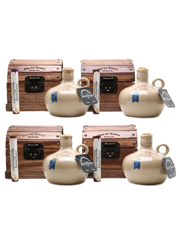 This case contains four ceramic jugs of Isla del Tesoro Extra Añejo rum from Santiago de Cuba. Isla del Tesoro Extra Añejo is a blended rum aged for a minimum of 20 years, and each jug is presented in a wooden treasure chest and a hessian bag.
