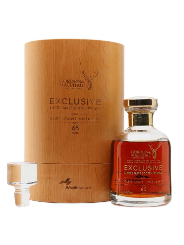A bottle of Glen Grant 65 Year Old, exclusively bottled for Polish company Wealth Solutions. This was distilled in 1950, matured in a single American white oak cask (which was likely first used to transport sherry to the UK), and bottled on 14 October 2015 by Gordon & MacPhail. This is presented in a numbered decanter with stopper in a round wooden box. The booklet details the history of Glen Grant distillery, as well as independent bottler Gordon & MacPhail and Wealth Solutions.