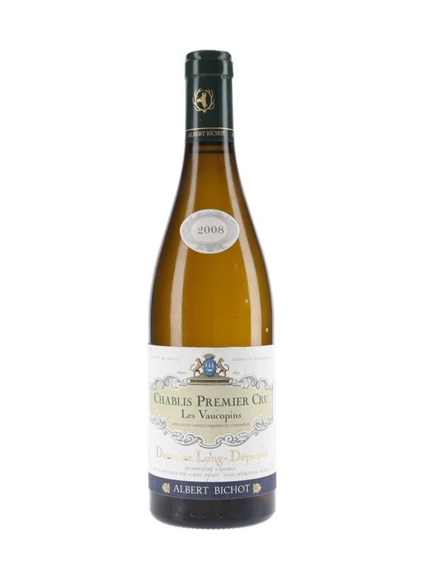 A bottle of 2008 Chablis Premier Cru Les Vaucopins, Domaine Long-Depaquit, bottled by Albert Bichot.