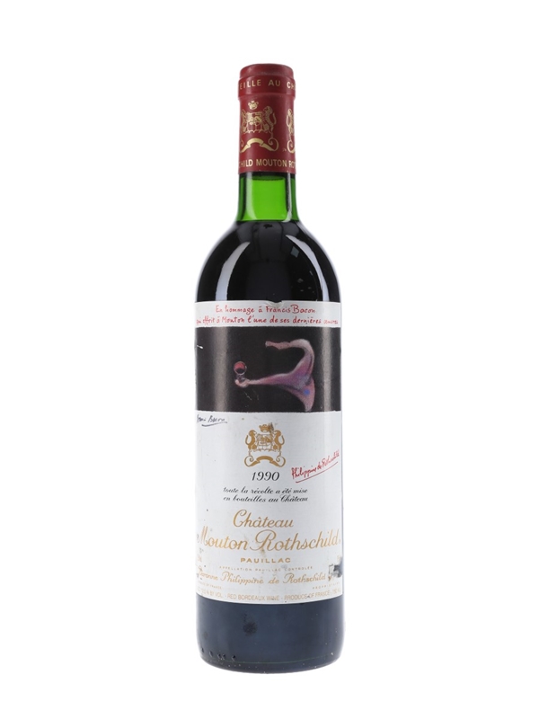 A bottle of 1990 Château Mouton Rothschild from Bordeaux's Pauillac appellation. The artwork on the label was created by Francis Bacon (1909-1992).