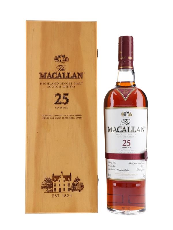 A bottle of The Macallan 25 Year Old Highland single malt Scotch whisky, exclusively matured in hand crafted sherry oak casks from Jerez, Spain, and presented in a wooden case.