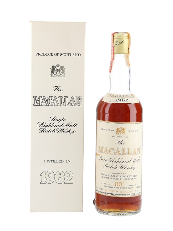 A bottle of The Macallan 1962, bottled by Campbell, Hope & King. This was bottled for the Italian market and imported by Rinaldi, we estimate in the 1970s.