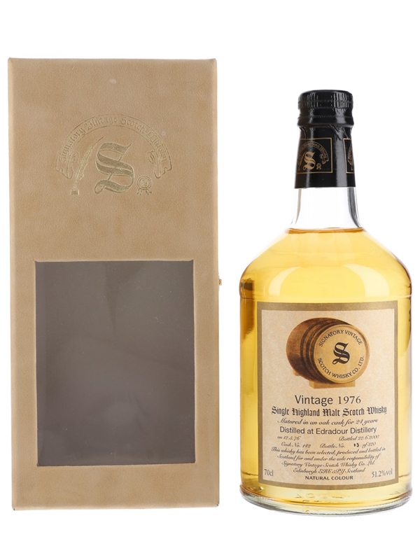 A bottle of Edradour 24 Year Old single Highland malt Scotch whisky. This was distilled on 12 May 1976, matured in a single oak cask and bottled on 22 June 2000 by Signatory Vintage.