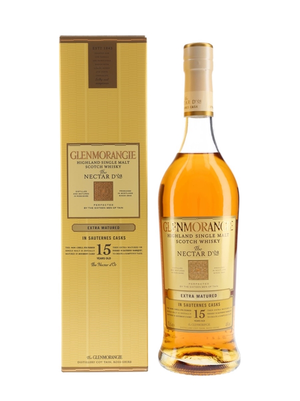 A bottle of Glenmorangie 15 Year Old Nectar D'Or. This was matured first in bourbon casks, before transferring to Sauternes wine barriques for extra aging.