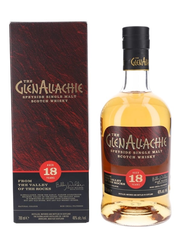 A bottle of The Glenallachie 18 Year Old Speyside single malt Scotch whisky. This bottle is signed by Billy Walker, Master Distiller.