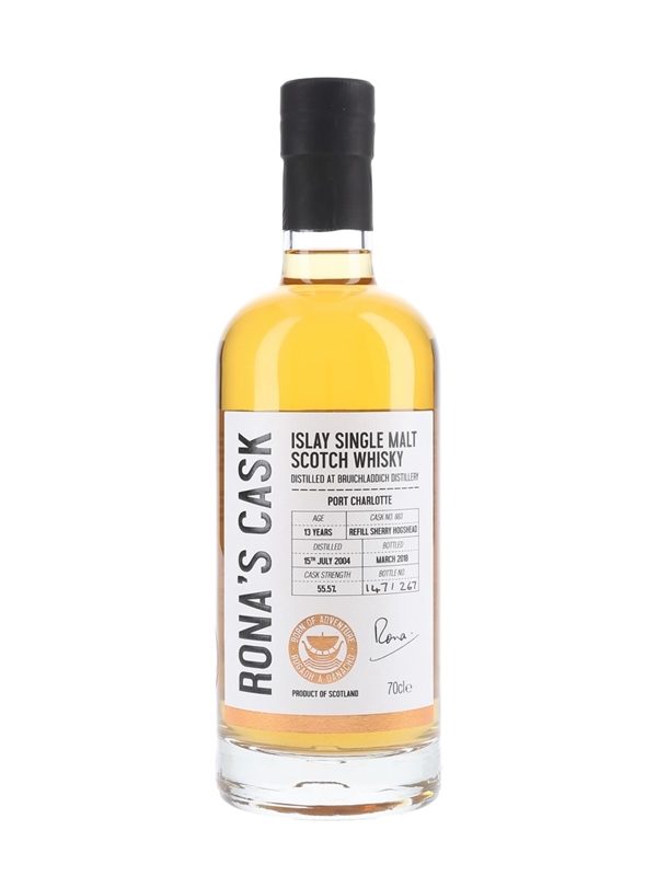 A bottle of Port Charlotte 13 Year Old Rona's Cask. This was distilled on 15 July 2004 at Bruichladdich distillery, matured in a single refill sherry hogshead and bottled at cask strength in March 2018 by The Islay Boys Ltd. It was bottled for Rona MacKenzie of Port Charlotte, Islay Boy Donald MacKenzie's mother.