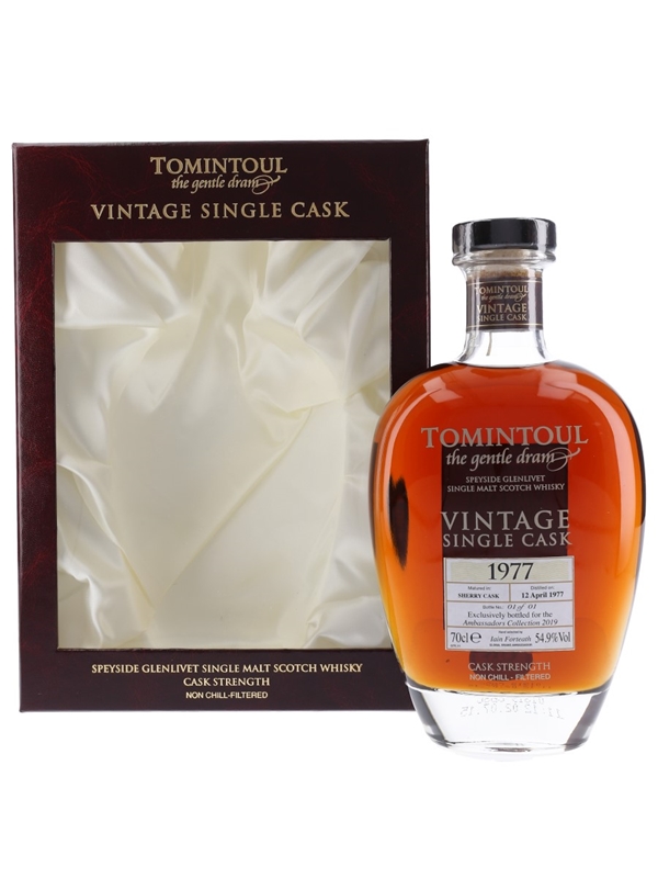 A bottle of Tomintoul 1977 The Gentle Dram. This vintage single cask expression was distilled on 12 April 1977 and matured in sherry casks before bottling at cask strength in 2015. This was selected for the Ambassadors Collection 2019.