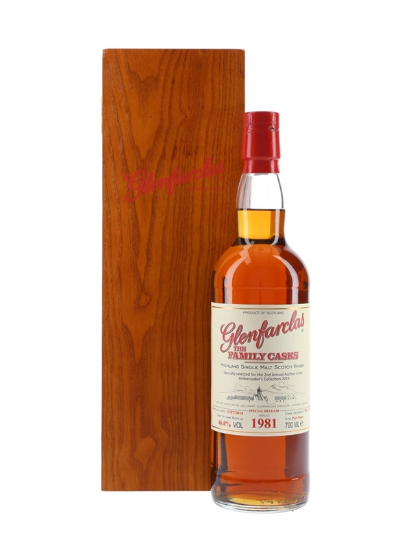 A bottle of Glenfarclas 1981 The Family Casks. This special release was distilled in 1981, matured in port pipes and bottled on 11 July 2014. This bottling was specially selected for The 2nd Annual Auction of the Ambassadors Collection 2019.