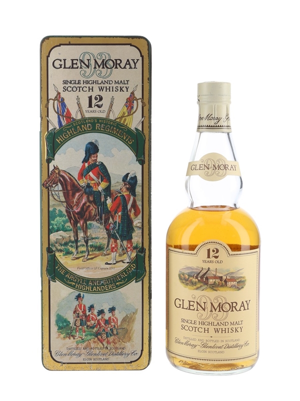 A bottle of Glen Moray 12 Year Old in a Scotland's Historic Highland Regiments tin. This tin depicts the Argyll And Sutherland Highlanders. We estimate this was bottled in the 1980s.