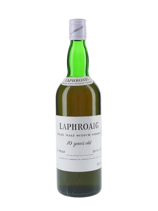 A bottle of Laphroaig 10 Year Old single malt Scotch whisky, distilled and bottled in Scotland by D Johnston & Co. Ltd. We estimate this was bottled in the late 1970s.