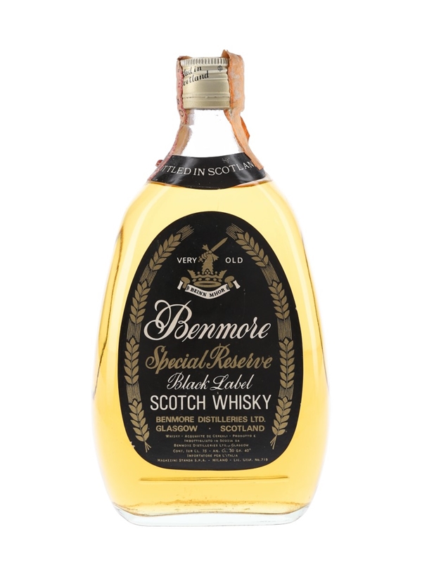 A bottle of Benmore Black Label Special Reserve. This was bottled in Scotland by Benmore Distilleries Ltd. for the Italian market and imported by Magazzini Standa, we estimate in the 1980s.