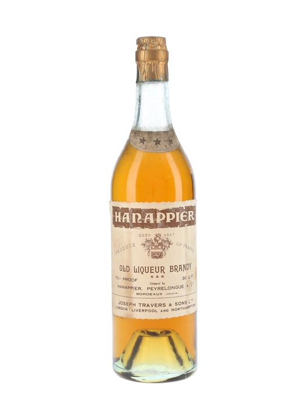 A bottle of Hanappier 3 Star Old Liqueur Brandy from France. This was shipped by Hanappier, Peyrelongue & Co. and imported to the UK by Joseph Travers & Sons Ltd. We estimate this was bottled in the 1940s to 1950s.