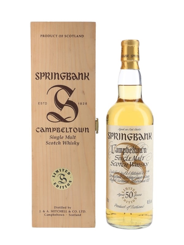 A bottle of Springbank 50 Year Old, bottled as part of the Millennium series. This was originally sold as part of a set which included whiskies ranging from 25 to 50 years old.