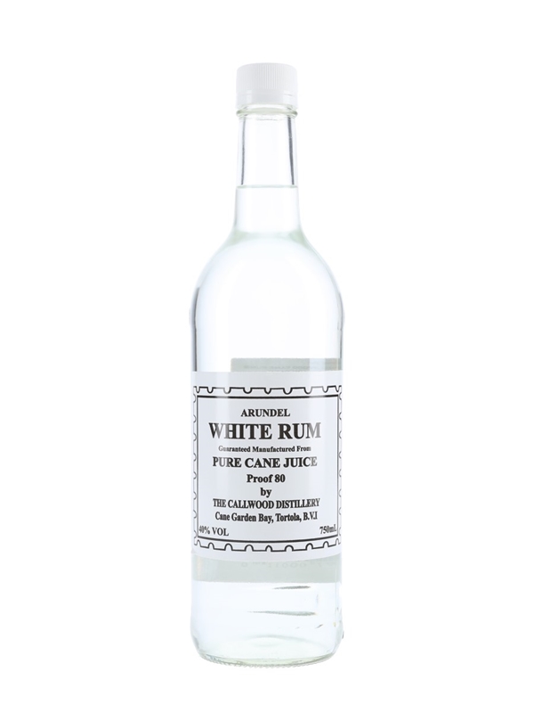 A bottle of Arundel White Rum, produced at Callwood Rum Distillery in Tortola, British Virgin Islands. This expression was distilled from pure sugar cane juice and stored in glass demijohns before bottling.