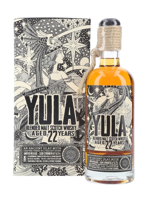 A bottle of Yula 22 Year Old blended malt Scotch whisky, a blend of Islay and Island vatted together. This is the chapter three and was bottled by Douglas Laing as a part of the Ancient Islay Myth series.
