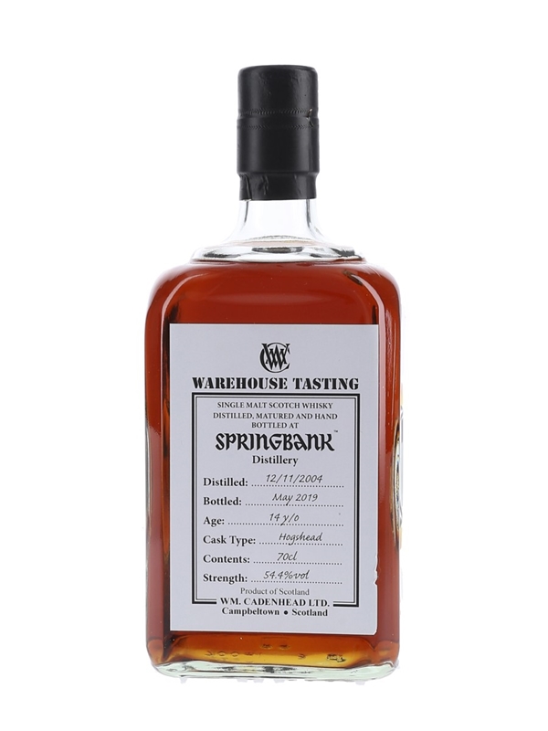 A bottle of Springbank 14 Year Old, distilled on 12 November 2004 and bottled at 54.4% ABV in May 2019. This was available exclusively from Cadenhead's Tasting Warehouse.