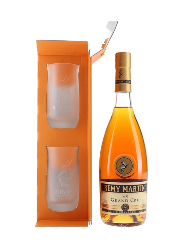 A bottle of Rémy Martin VS Grand Cru, made from grapes grown in the Petite Champagne region of Cognac. This bottle comes with a pair of branded glasses.
