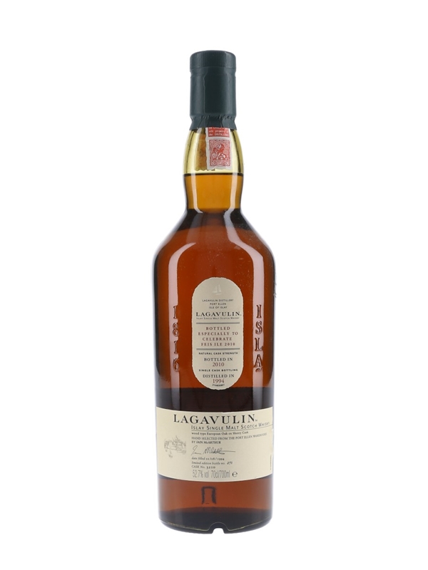 A bottle of Lagavulin released to celebrate Feis Ile 2010. This was distilled in 1994, matured in a single sherry cask, and bottled at cask strength in 2010.