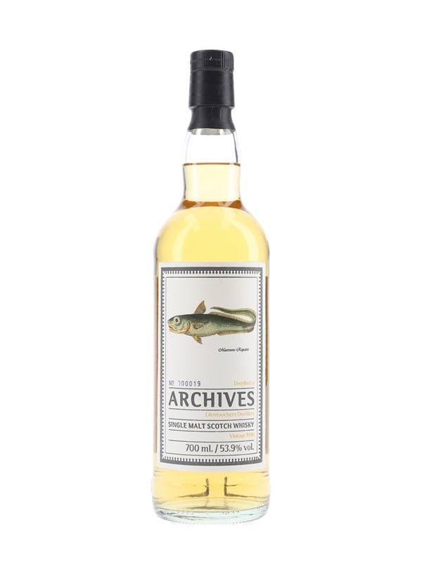 A bottle of Glentauchers 20 Year Old. This was distilled on 4 December 1996, matured in a single barrel and bottled on 19 May 2017 by Archives as a part of The Fishes of Samoa series. The label features an image of the Roundnose Grenadier by Ray van der Mevlen.