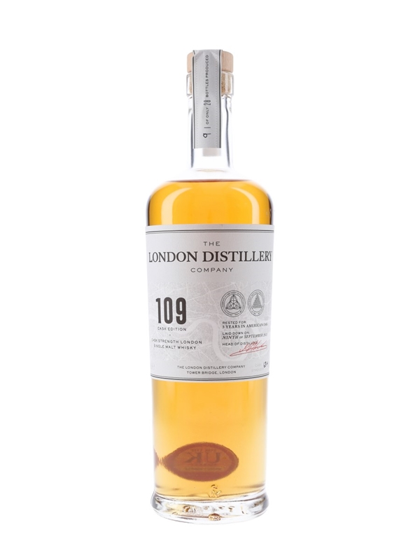 A bottle of The London Distillery Company 109 Cask Edition single malt whisky. This was produced from Plummage Archer barley using 1920s distiller and Whitbread B yeast. The whisky was filled in to 20 litre ex-bourbon casks on 9 September 2015, and matured for three years before bottling at cask strength.
