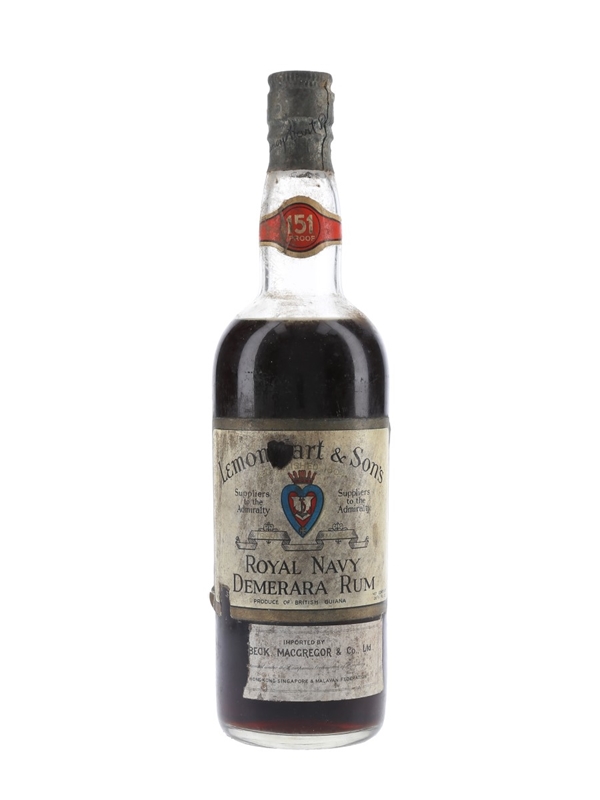 A bottle of Lemon Hart 151 Proof Royal Navy Demerara Rum, produce of British Guiana. This was imported by Caldbeck, Macgregor & Co. Ltd. for China, Hong Kong, Singapore and Malayan Federation. We estimate this was bottled in the 1940s.