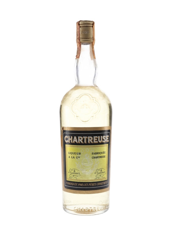 A bottle of yellow Chartreuse liqueur bearing the embossed coat of arms known as 'El Gruño'. This was bottled in Voiron, France, and imported to Italy by Soffiantino, we estimate in 1965 to 1966.