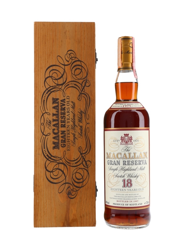 A bottle of The Macallan 18 Year Old Gran Reserva. This was distilled in 1979, matured in sherry casks and bottled in 1997.