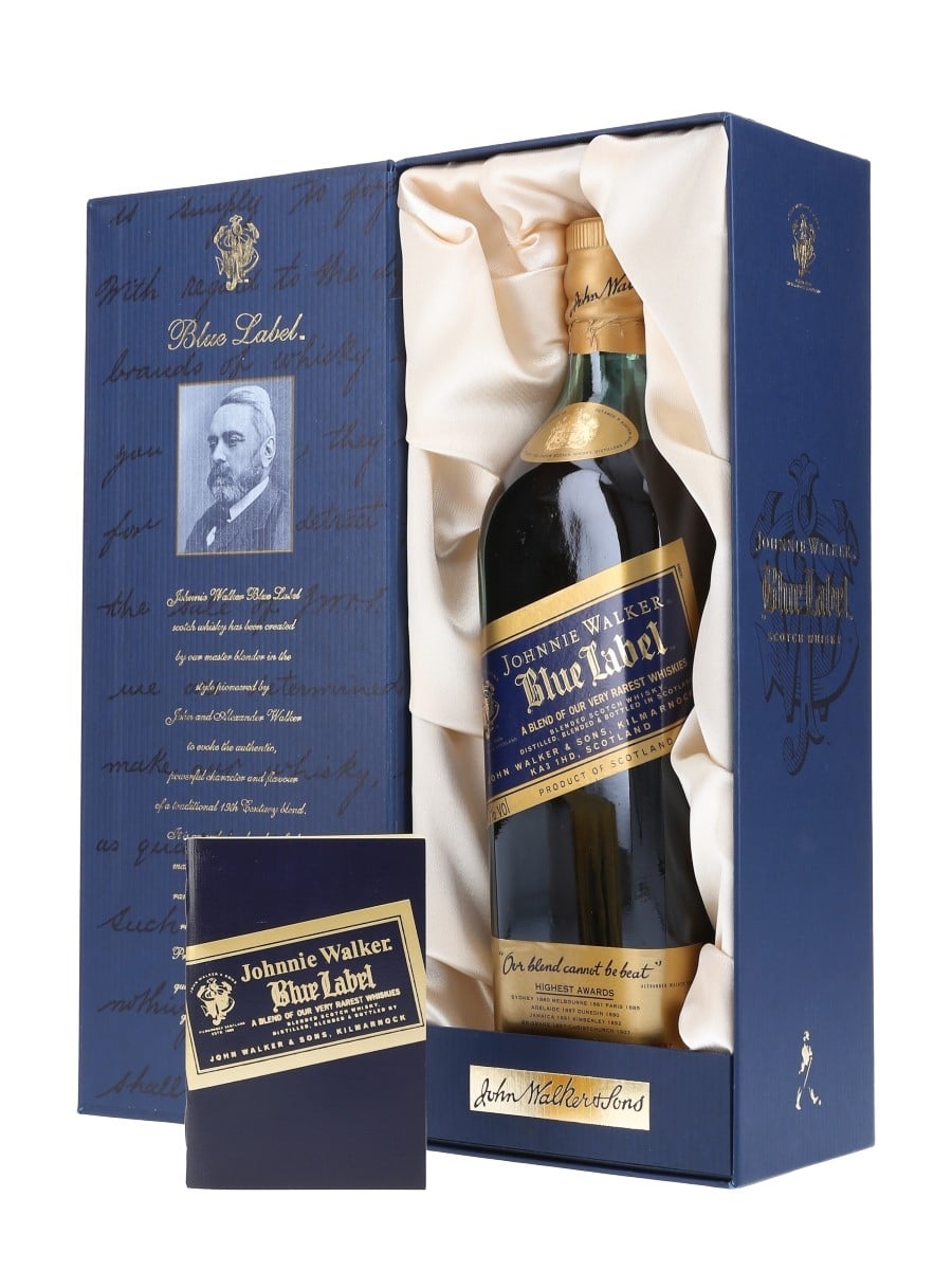 A bottle of Johnnie Walker Blue Label, a super premium blend made from long-aged malt and grain whiskies.