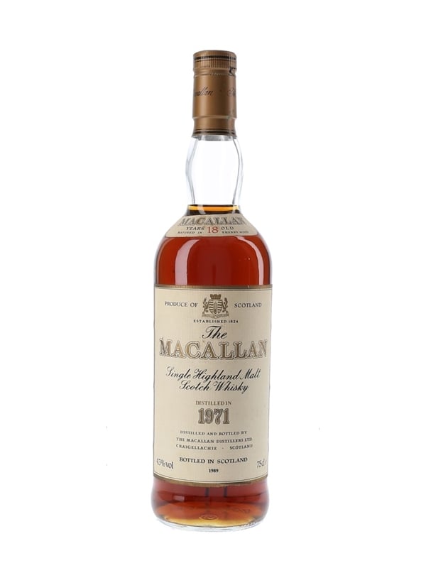 A bottle of The Macallan 18 Year Old Single Highland Malt Scotch Whisky, distilled in 1971, matured in sherry casks and bottled in 1989.