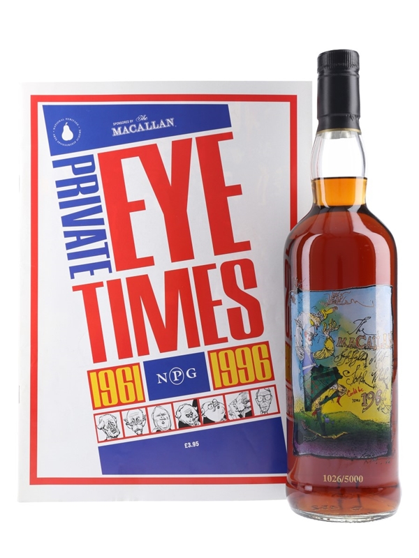 A bottle of The Macallan released in 1996 to celebrate the 35th anniversary of satirical magazine Private Eye. This is a vatting of casks selected by whisky maker FA Newlands and includes a cask from 1961, the year Private Eye was founded.