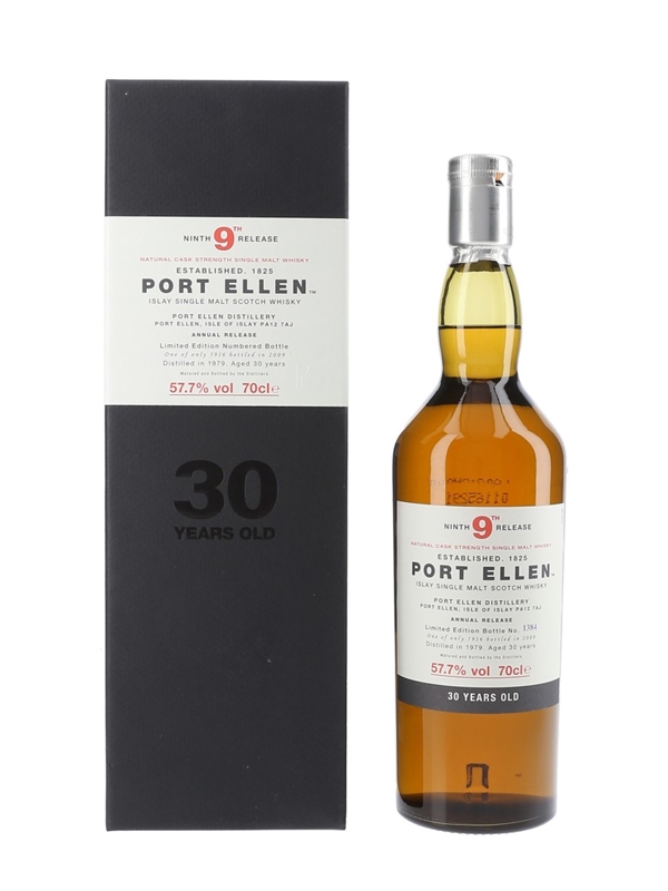 A bottle of Port Ellen 30 Year Old Single Malt Scotch Whisky. This was distilled in 1979 and bottled at a cask strength of 57.7% ABV in 2009. This is the ninth release of Port Ellen from Diageo's Special Releases series.