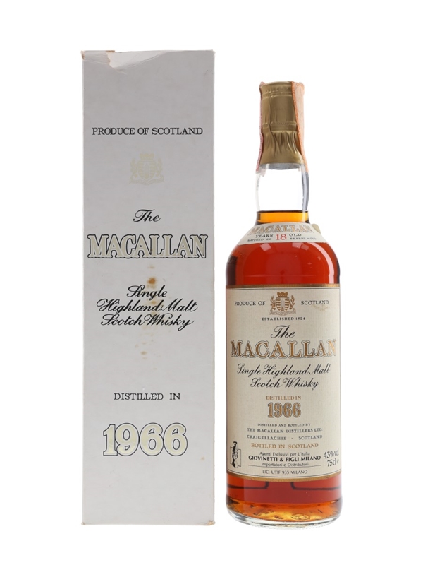 A bottle of The Macallan 18 Year Old Single Highland Malt Scotch Whisky. This was distilled in 1966, matured in sherry casks and bottled for Italian importer Giovinetti.