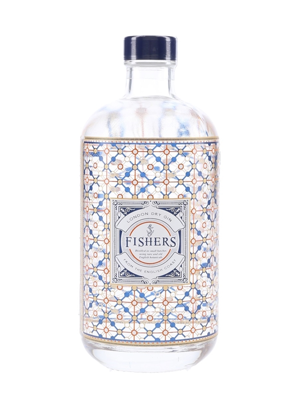 A bottle of Fishers London Dry Gin, made with rare and old English botanicals and distilled in small batches.