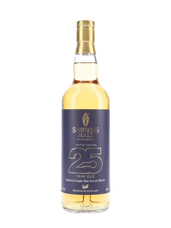 A limited edition bottle of Simpsons Malt 25 Year Old Highland single malt Scotch whisky. This whisky was distilled at an undisclosed distillery and specially selected by Simpson's Malt, suppliers of malted barley to the beer and Scotch whisky industries, to commemorate the company's 155th anniversary.