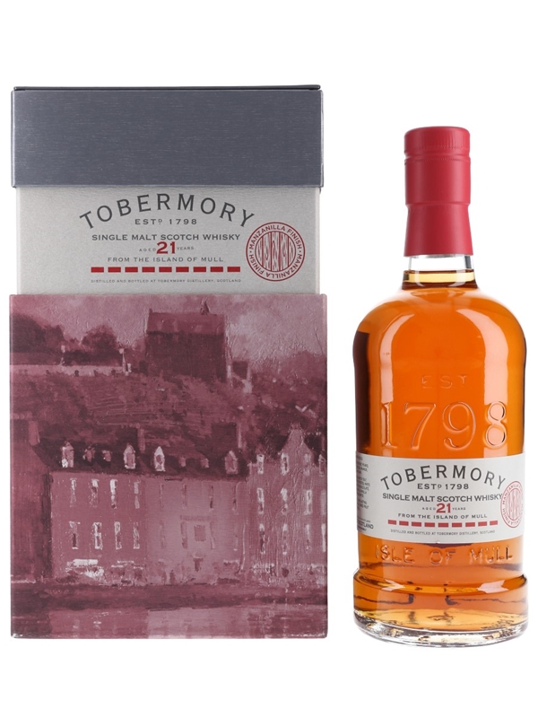 A bottle of Tobermory 21 Year Old single Island malt Scotch whisky, from the island of Mull, finished in Manzanilla sherry casks.