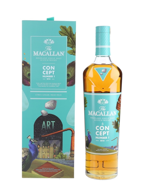 A bottle of The Macallan Concept Number 1, a 2018 release inspired by surreal art. This is made from whiskies matured first in sherry seasoned oak casks and then for an equal period in ex-bourbon casks.