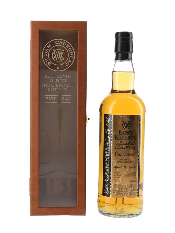 A bottle of Hazelburn 7 Year Old Single Malt Scotch Whisky. This was distilled in 2001 at Springbank Distillery, matured in small oak casks and bottled in November 2008 by William Cadenhead for the Bond Reserve series.