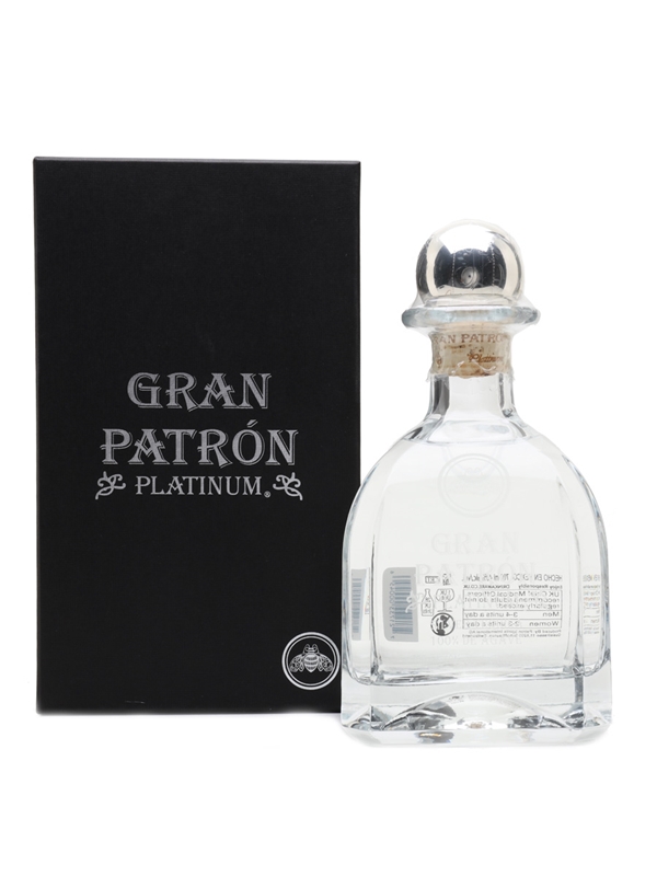 A bottle of Gran Patron Platinum, a premium Tequila made from 100% Weber blue agave. The agave is hand-selected for its high sugar content, steamed, crushed, fermented and distilled using traditional techniques. This Tequila is triple distilled, and matured in oak casks for a short time before filtering to remove the colour obtained from the cask. Each bottle is hand-polished and numbered.