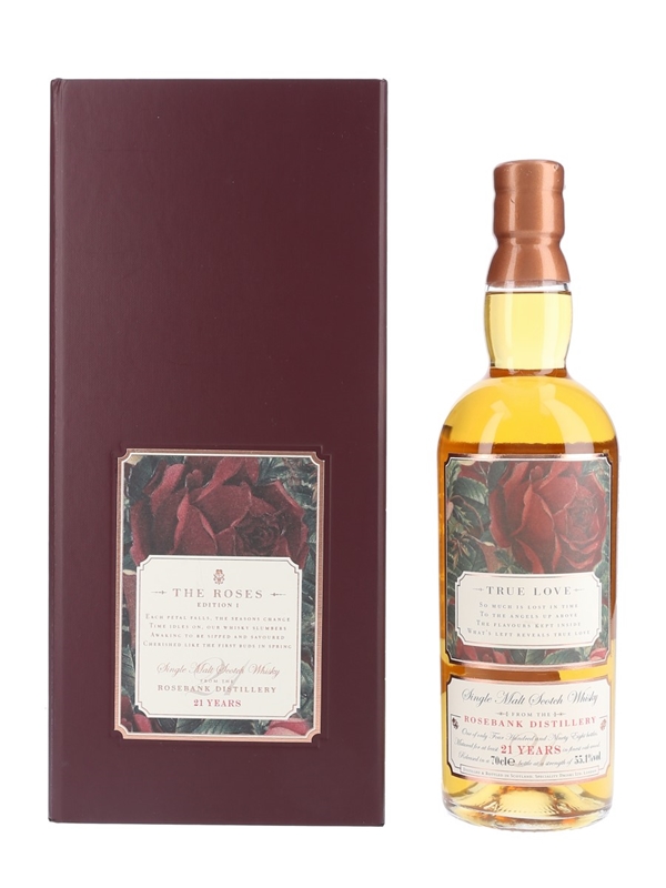 A bottle of Rosebank 21 Year Old, bottled by Speciality Drinks Ltd. This release, True Love, is the first edition in the Rosebank Roses series.