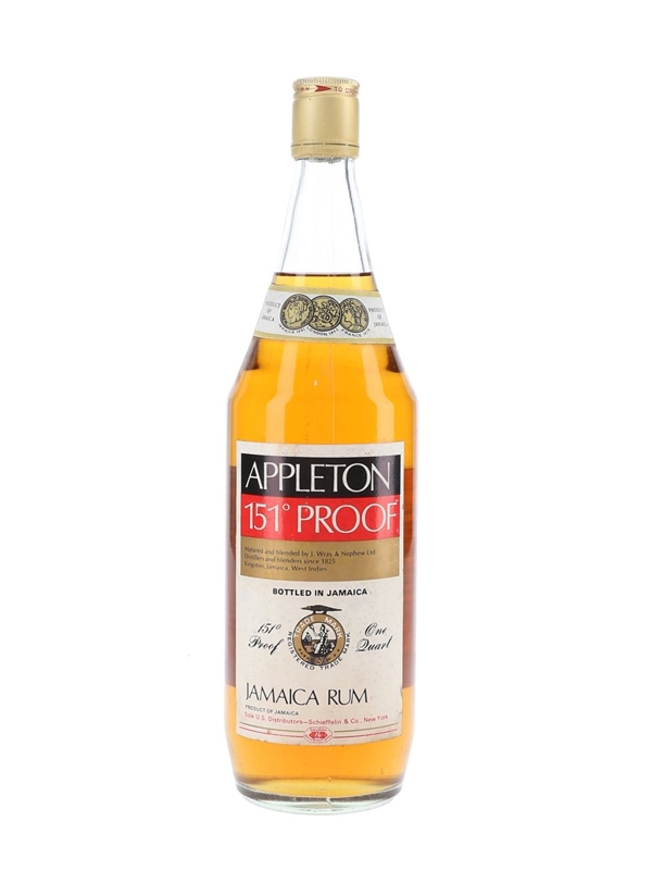 A 94.6cl bottle of Appleton 151 Proof Jamaica rum, produced and bottled by J Wray & Nephew for the American market. We estimate this was bottled in the 1970s.