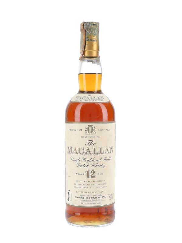 A bottle of The Macallan 12 Year Old, matured in sherry wood. This was bottled for the Italian market and imported by Giovinetti, we estimate in the 1980s.