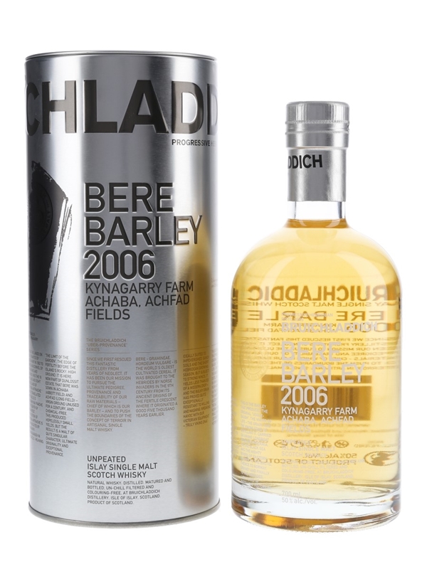 A bottle of Bruichladdich Bere Barley 6 Year Old. This was in 2006 distilled from barley grown on Kynagarry Farm in the Achaba and Achfad fields.