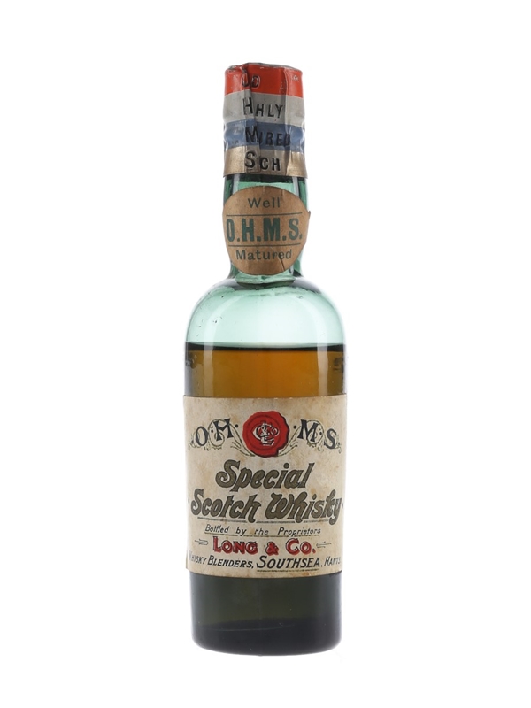 A bottle of Long & Co. OHMS (Old Highly Matured Scotch) Special Scotch Whisky, bottled by Long & Co., Whisky Blenders, Southsea. We estimate this was bottled in the 1930s.
