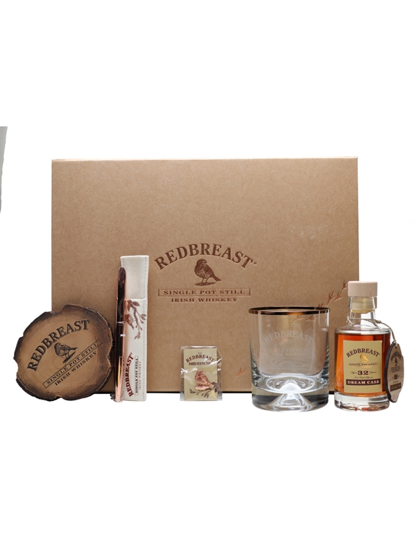 A 10cl bottle of Redbreast 20 Year Old Dream Cask Single Pot Still Irish Whiskey. This set includes a branded pen, pin badge, tumbler and wooden coaster.