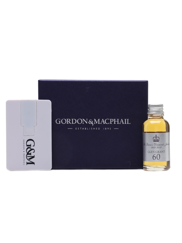 A 3cl sample bottle of Glen Grant 60 Year Old Single Malt Scotch Whisky. This was distilled on 2 February 1952, matured in a sherry cask and bottled at cask strength on 2 February 2012 By Gordon & MacPhail to celebrate Her Majesty The Queen Elizabeth's Diamond Jubilee. This miniature bottle comes in a purple Harris Tweed bag with a USB flash drive.
