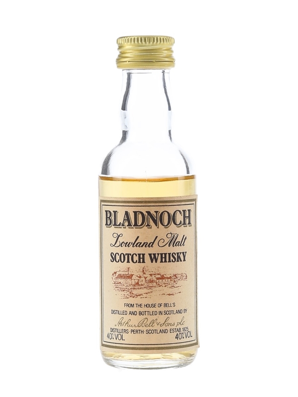A miniature bottle of Bladnoch Lowland malt Scotch whisky, distilled and bottled in Scotland by Arthur Bell & Sons plc. We estimate this was bottled in the 1980s.